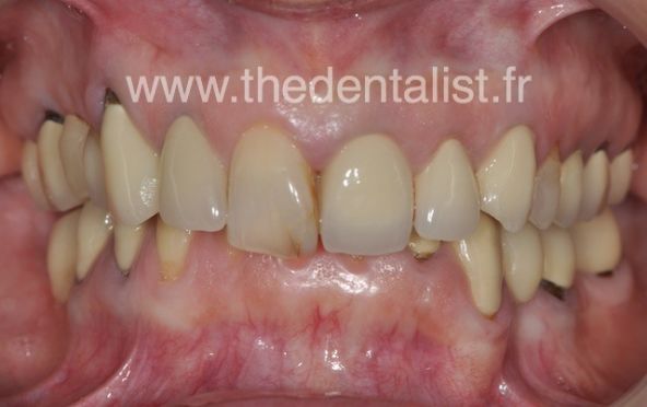 Patiente de 44 ans qui consulte pour une amélioration esthétique de son sourire altéré par d’anciennes prothèses fixées et une forte supraclusion. Dans la mesure où un grand nombre de dents doivent être restaurées, nous avons décidé de lever la supraclusion en augmentant la dimension verticale d’occlusion. Cela permet d’améliorer le pronostic des dents antérieures (déjà usées à la mandibule), l’esthétique du sourire et le positionnement mandibulaire.